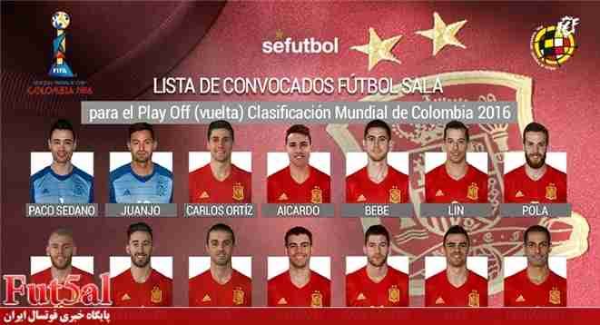 به گزارش پایگاه خبری فوتسال ایران، خوزه وانانسیو لوپز، سرمربی تیم ملی فوتسال اسپانیا ۱۴ بازیکن را به اردوی تیم ملی این کشور دعوت کرد. این بازیکنان برای در دیدار برگشت مقابل اسلوونی در، پلیآف صعود به جامجهانی ۲۰۱۶ کلمبیا در منطقه اروپا به اردو دعوت شدهاند. تیم ملی فوتسال اسپانیا در دیدار رفت با نتیجه یک بر صفر مغلوب اسلوونی شده بود. این دو تیم در تاریخ ۱۲ آپریل (۲۴ فروردین) در سالن خاویر امبرودا اورتیز شهر ملیلیه به دیدار هم خواهند رفت. از نکات برجسته این فهرستبازگشت خوانخو، آیکاردو و آدری به تیم ملی بود. همچنین حذف خسوس هررو و آندرسیتو به دلیل مصدومیت از نکات بارز این فهرست بود.