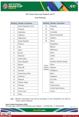به گزارش پایگاه خبری فوتسال، کنفدراسیون فوتبال آسیا ردهبندی نهایی تیمهای شرکتکننده در دورههای مقدماتی و نهایی جام ملتهای آسیا را بر اساس تمامی بازیهای انجام شده در این دوره از مسابقات رسما اعلام کرد.