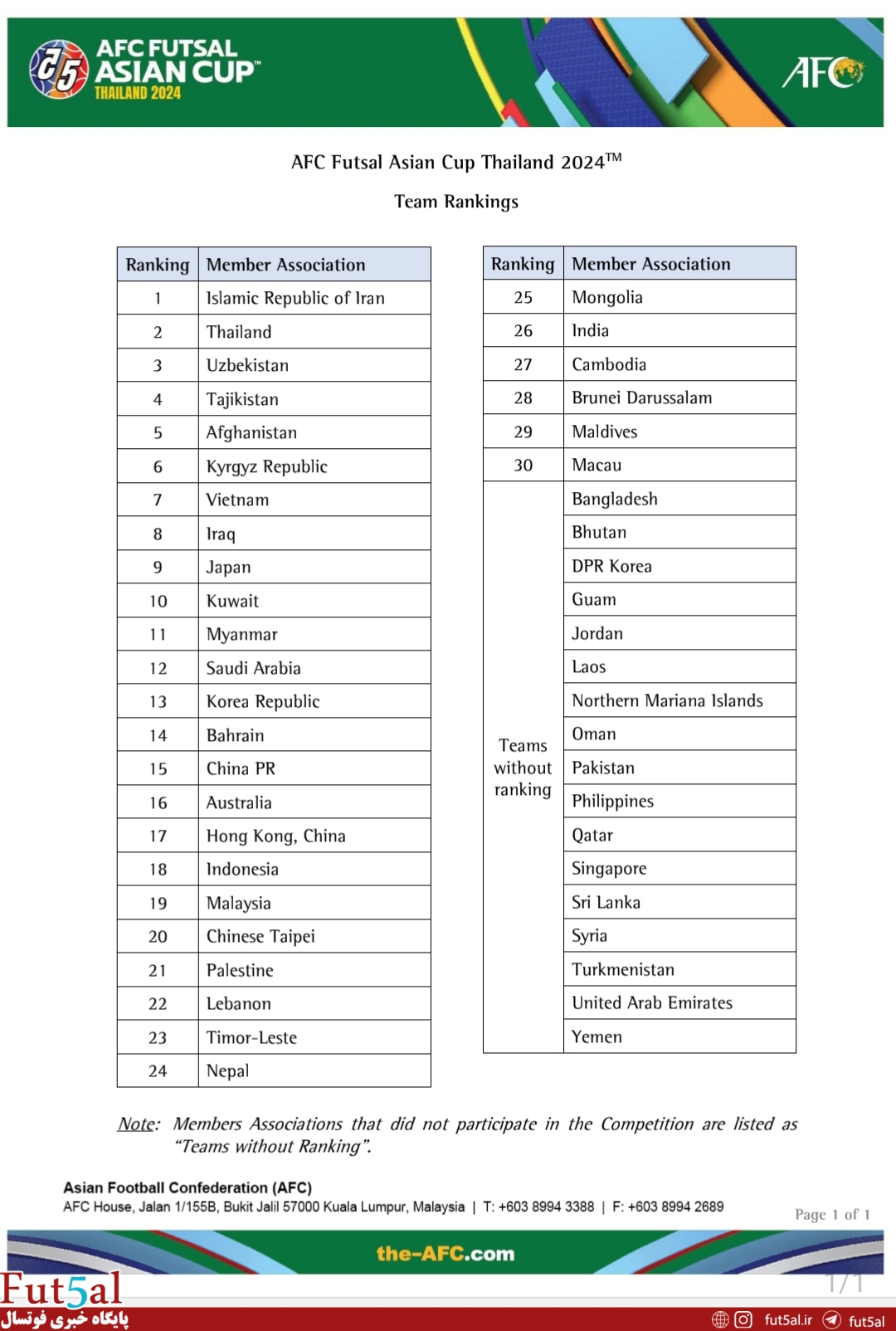 بنا به این ردهبندی تیمملی کشورمان با کسب عنوان قهرمانی در صدر جدول رقابتهای امسال قرار گرفته و تیمملی فوتسال افغانستان پس از راهیابی تاریخی به جامجهانی در رده پنجم قرار دارد. حضور ژاپن در رده نهم این جدول پس از حذف از دور گروهی از دیگر موارد قابل اشاره این جدول است.