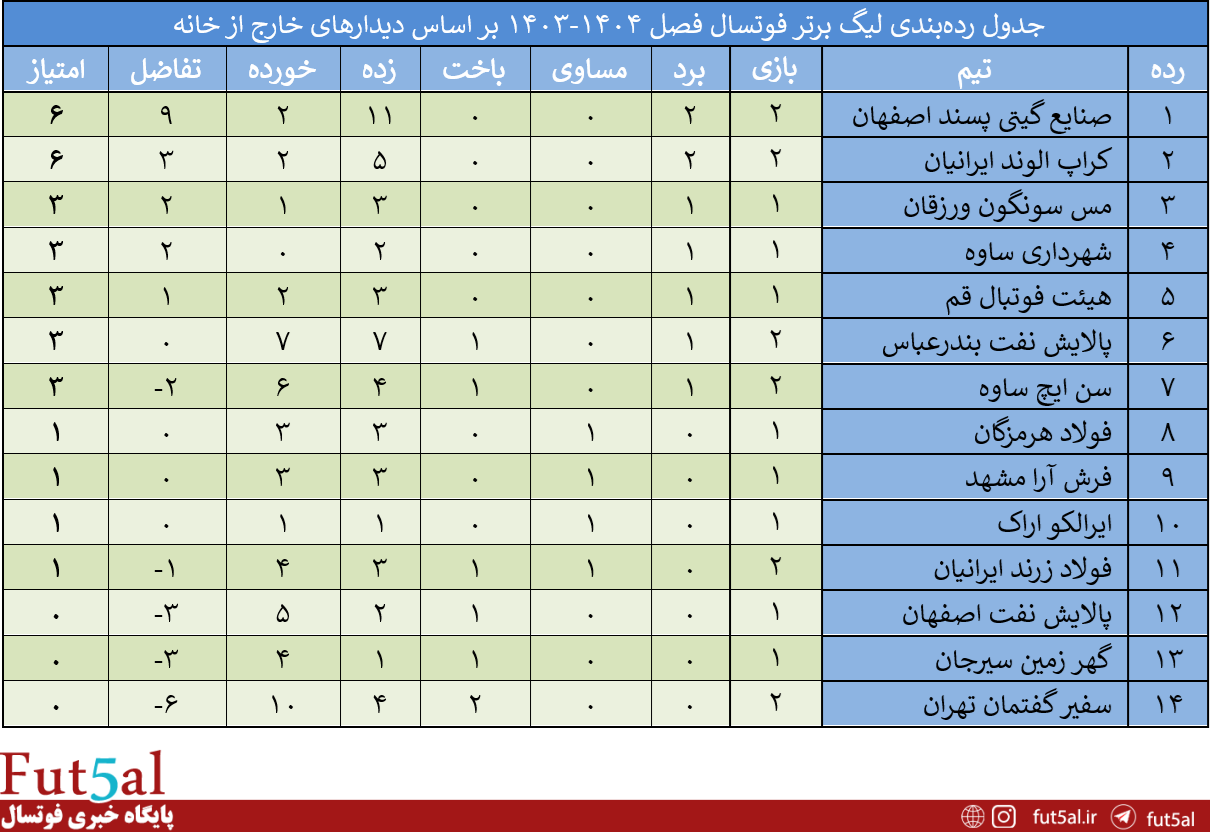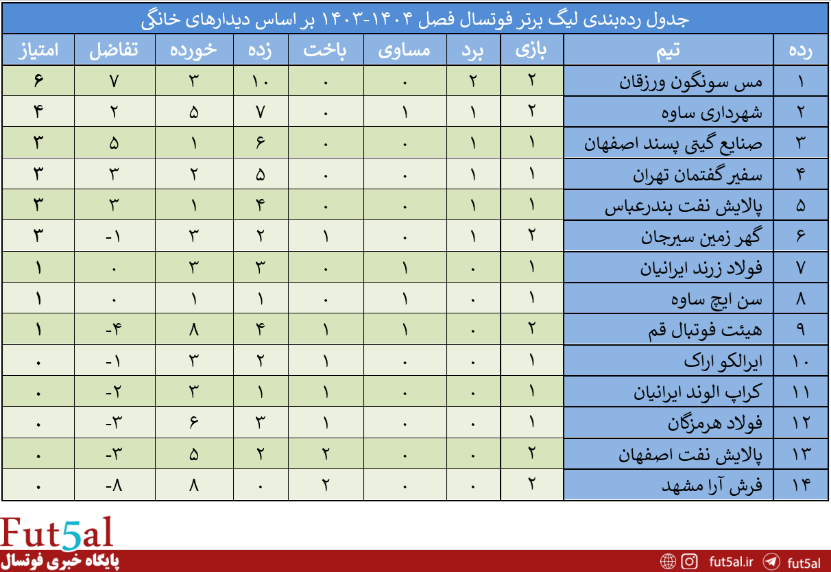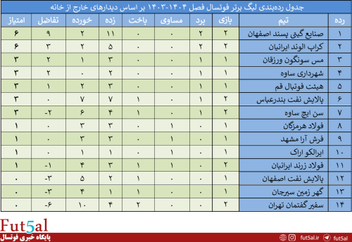 نتایج تیمهای تا پایان هفته دوم بر اساس عملکرد داخل و خارج از خانه