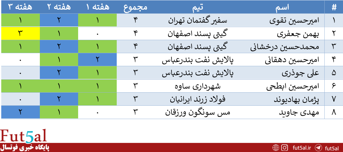 پایگاه خبری فوتسال/سعید پروا ، هر هفته به مرور آماری بازیهای لیگ برتر خواهیم پرداخت. بر این اساس آمار بازیهای لیگ پس از پایان هفته سوم به شرح زیر است:
