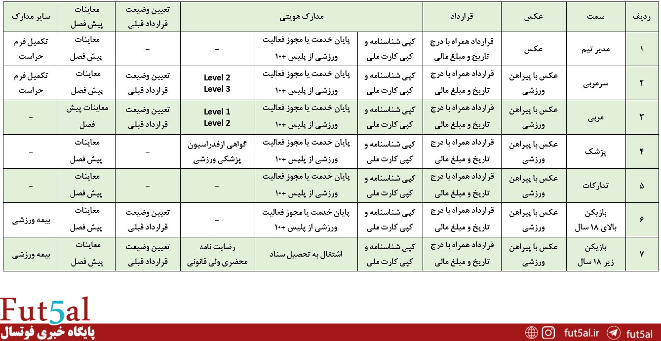 باشگاهها میبایست مدارک مورد نیاز این سازمان را بر اساس جدول ذیل، در خصوص کادر فنی و بازیکنان را تهیه نموده و جهت تأیید مدارک به هیأت فوتبال استان مربوطه مراجعه کرده و پس از ممهور نمودن مدارک، در مهلت مقرر با استفاده از کد کاربری و رمز عبور که قبلاً در اختیار باشگاهها قرار گرفته، مدارک را در سامانه عضویت فدراسیون فوتبال به آدرس reg.ffiri.ir بارگذاری نموده و پس از آن، اصل مدارک را نیز جهت بررسی نهایی به واحد نقل و انتقالات سازمان لیگ فوتسال ارائه نموده و در صورت تکمیل بودن مدارک مذکور کارتهای شرکت در مسابقات را دریافت نمایند.