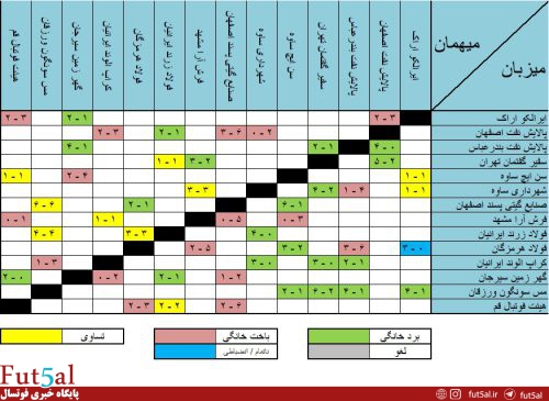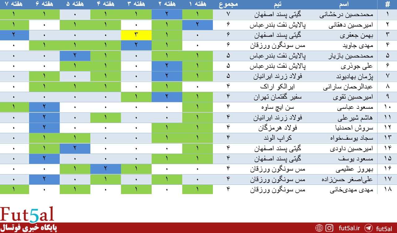 پایگاه خبری فوتسال، سعید پروا ، هر هفته به مرور آماری بازیهای لیگ برتر خواهیم پرداخت. بر این اساس آمار بازیهای لیگ پس از پایان هفته هفتم به شرح زیر است: