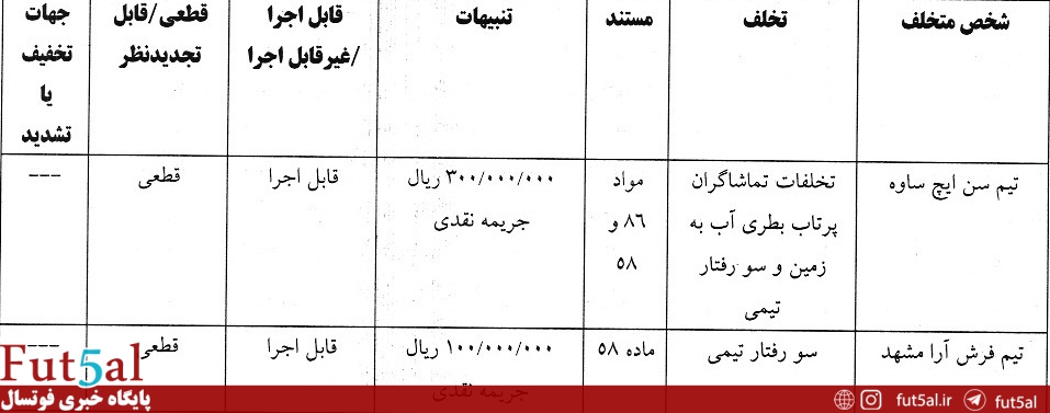 رای تخلفات تیم های فرش آرا و سن ایچ ساوه به شرح زیر است:
