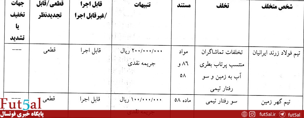 رای تخلفات تیم های فولاد زرند و گل گهر به شرح زیر است: