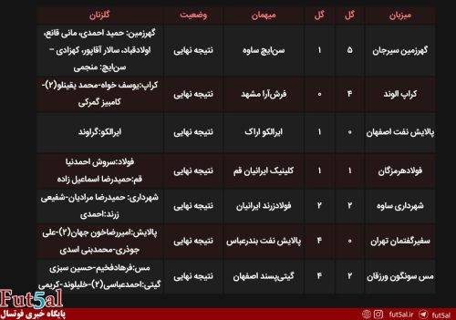 نتایج کامل دیدارهای امروز و جدول بازیها به شرح زیر است: