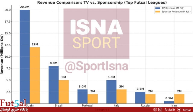 نمودار زیر مقایسهای از درآمدهای پخش تلویزیونی و اسپانسرها در پنج لیگ معتبر فوتسال جهان و ایران را نشان میدهد: