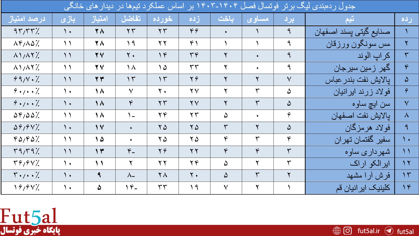 بیشترین باخت: پالایش نفت اصفهان، فرش آرا مشهد و کلینیک ایرانیان قم (۱۳ باخت)