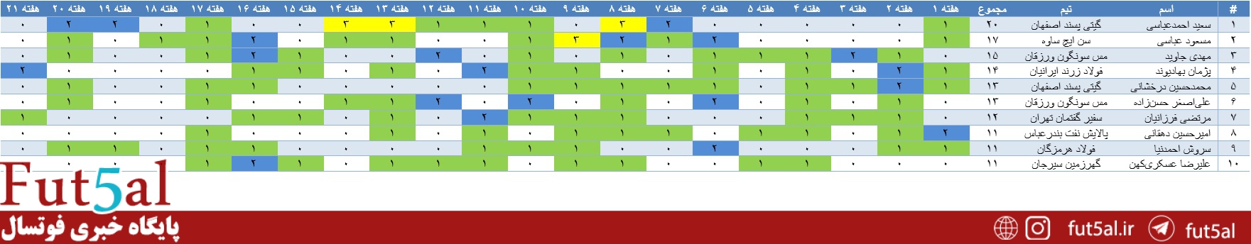 به گزارش پایگاه خبری فوتسال، هر هفته به مرور آماری بازیهای لیگ برتر خواهیم پرداخت. بر این اساس آمار بازیهای لیگ پس از پایان هفته بیستویکم به شرح زیر است: