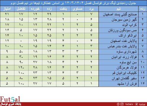 عملکرد تیمها در نیمفصل دوم بازیها