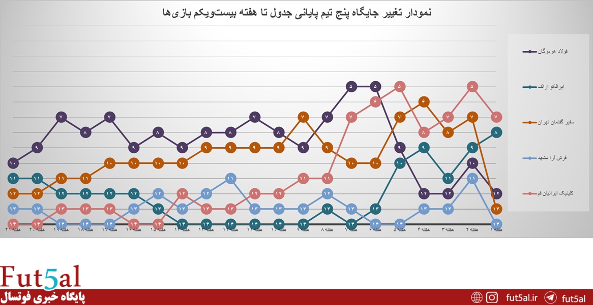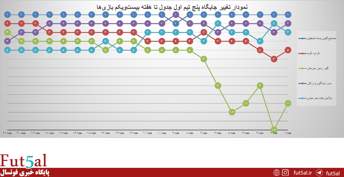 تغییر جایگاه پنج تیم ابتدایی جدول ردهبندی تا پایان هفته بیستویکم