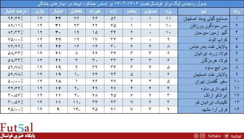 پایگاه خبری فوتسال/سعید پروا، هر هفته به مرور آماری بازیهای لیگ برتر خواهیم پرداخت. بر این اساس آمار بازیهای لیگ پس از پایان هفته بیستوچهارم به شرح زیر است: