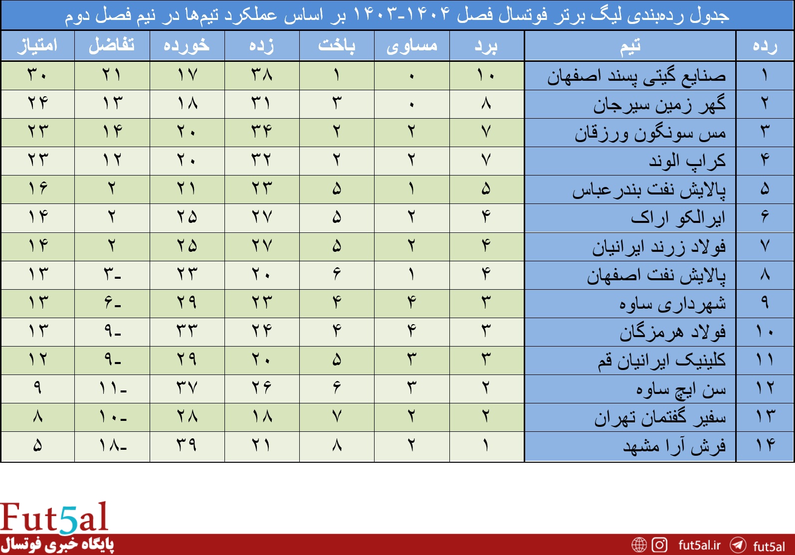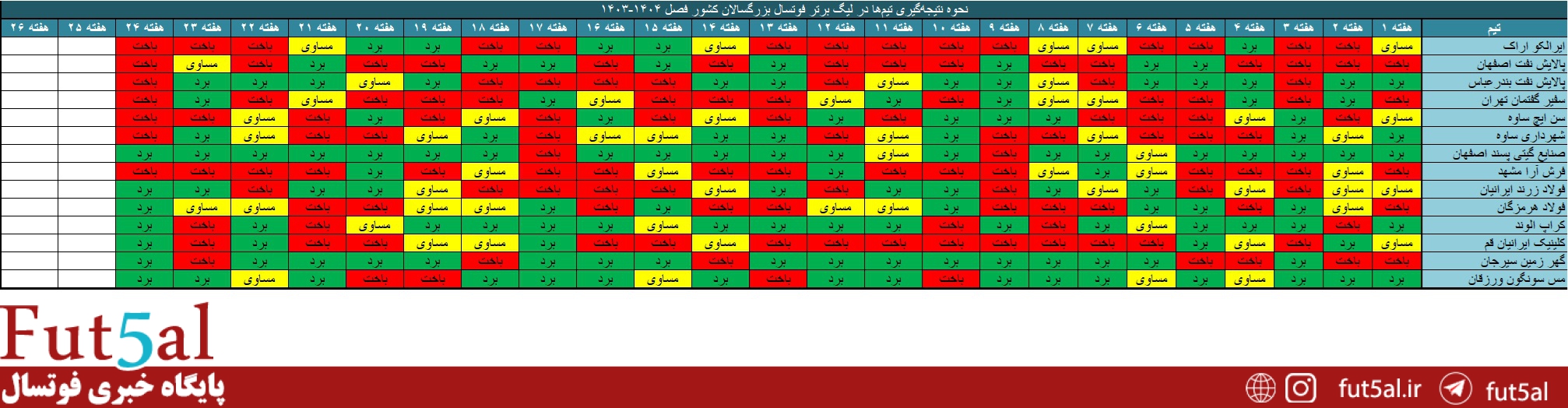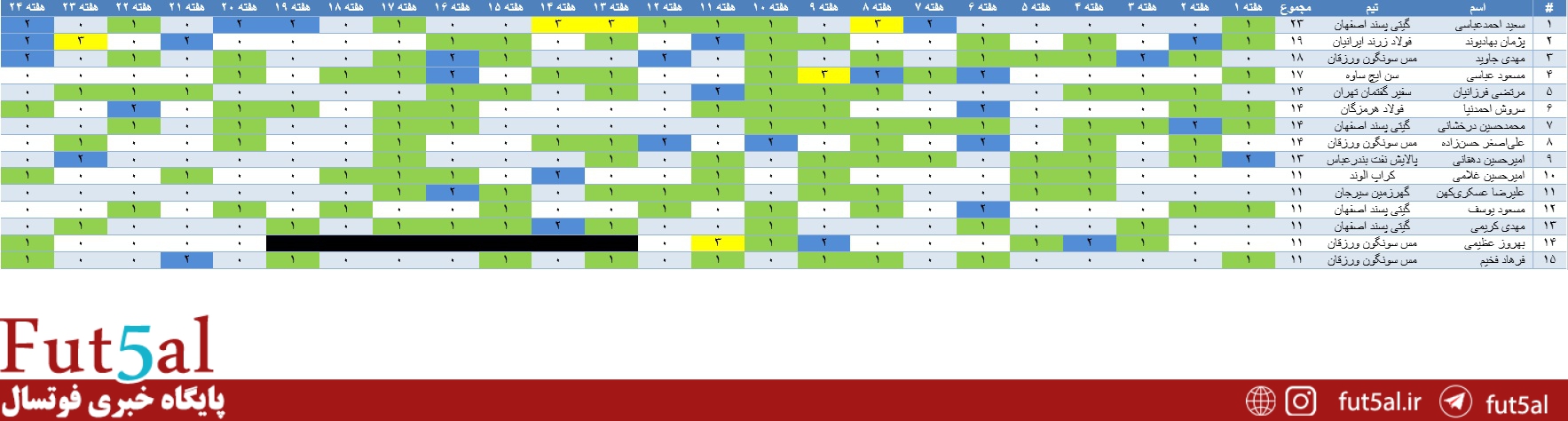 پایگاه خبری فوتسال/سعید پروا، هر هفته به مرور آماری بازیهای لیگ برتر خواهیم پرداخت. بر این اساس آمار بازیهای لیگ پس از پایان هفته بیستوچهارم به شرح زیر است: