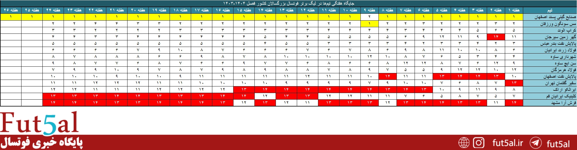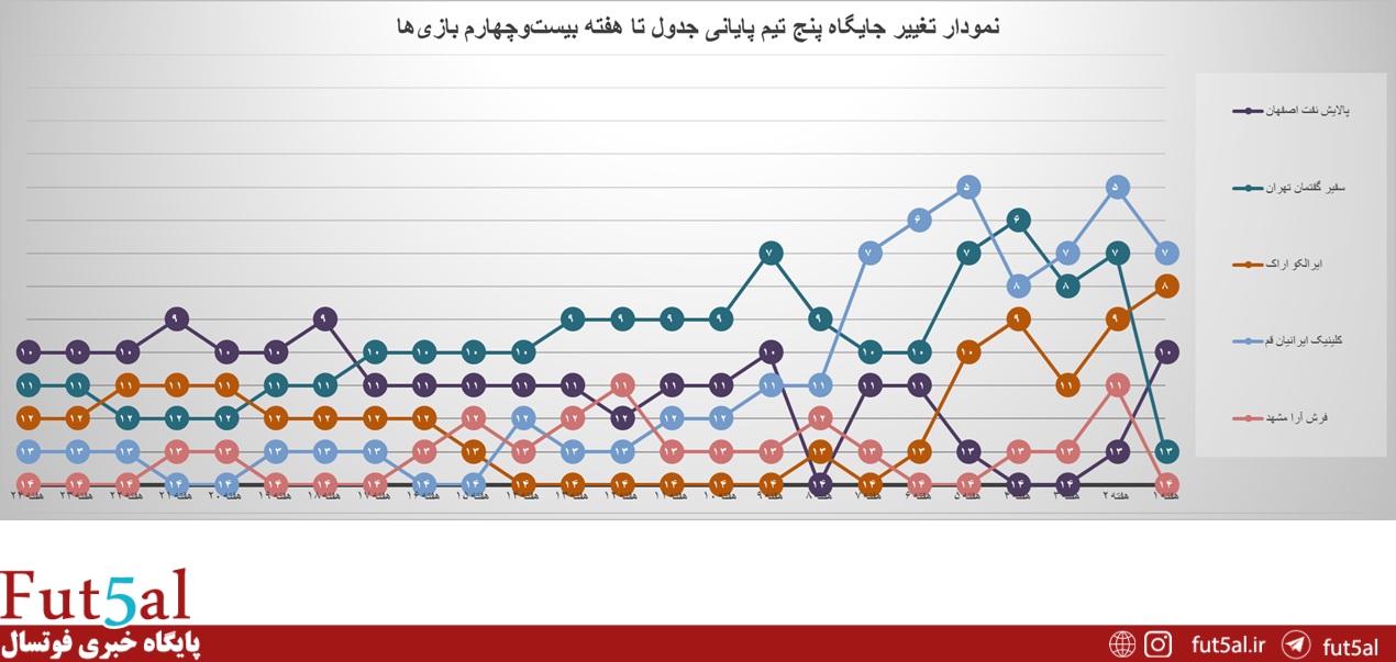 تغییر جایگاه پنج تیم ابتدایی جدول ردهبندی تا پایان هفته بیستوچهارم