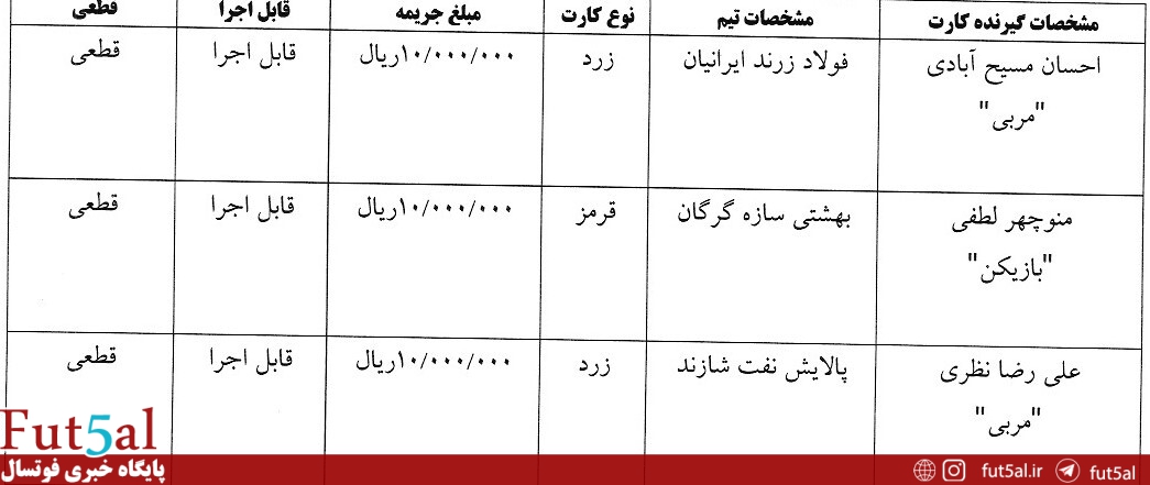 آرای کارت های زرد و قرمز هفته اول لیگ برتر فوتسال