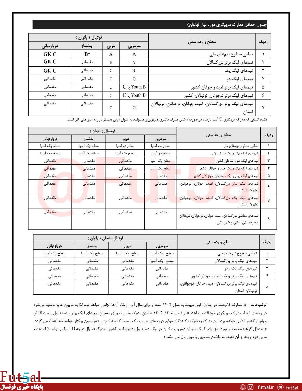 دستورالعمل فدراسیون فوتبال در خصوص حداقل مدرک مربیگری درسطوح مختلف آقایان و بانوان اعلام شد.