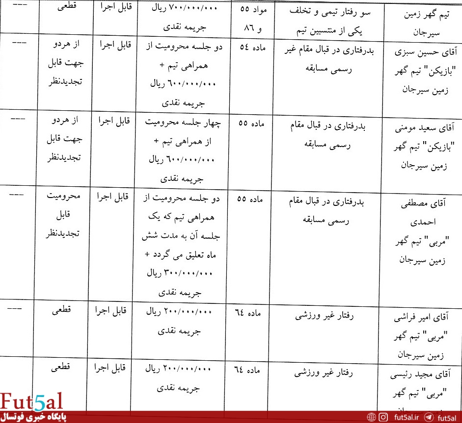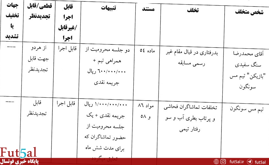 رای تخلفات سنگ سفیدی و تیم مس سونگون و همچنین سبزی ، مومنی ، احمدی ، فراشی ، رئیسی از تیم گهر زمین به شرح زیر است: