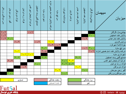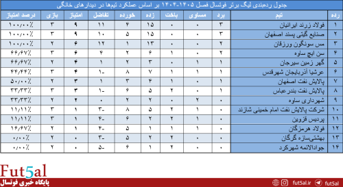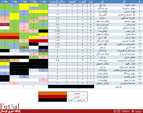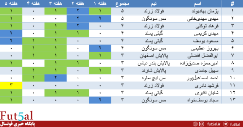 پایگاه خبری فوتسال/ سعید پروا، هر هفته به مرور آماری بازیهای لیگ برتر خواهیم پرداخت. بر این اساس آمار بازیهای لیگ پس از پایان هفته پنجم به شرح زیر است