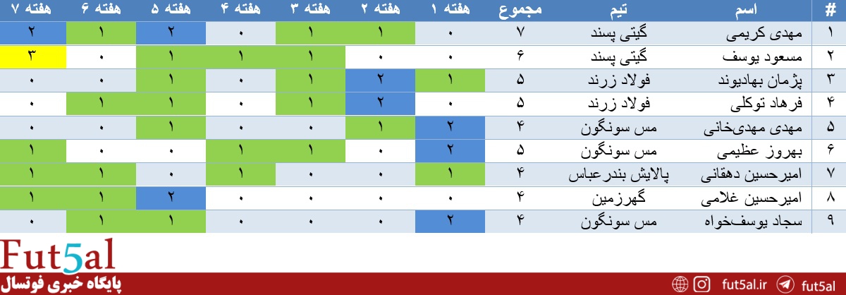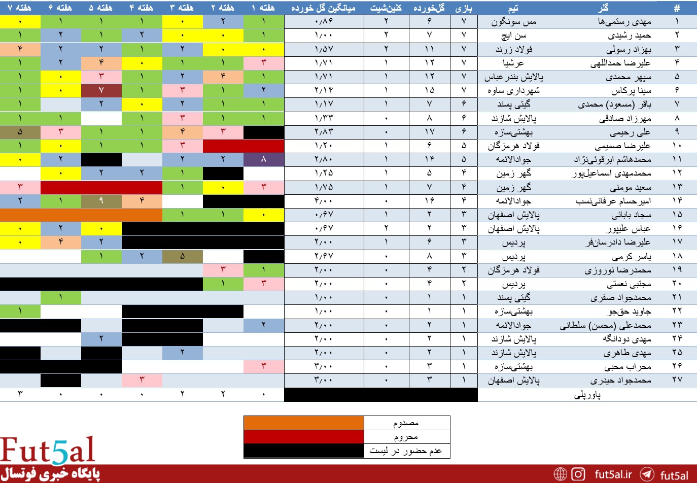 پایگاه خبری فوتسال/ سعید پروا، هر هفته به مرور آماری بازیهای لیگ برتر خواهیم پرداخت. بر این اساس آمار بازیهای لیگ پس از پایان هفته هفتم به شرح زیر است