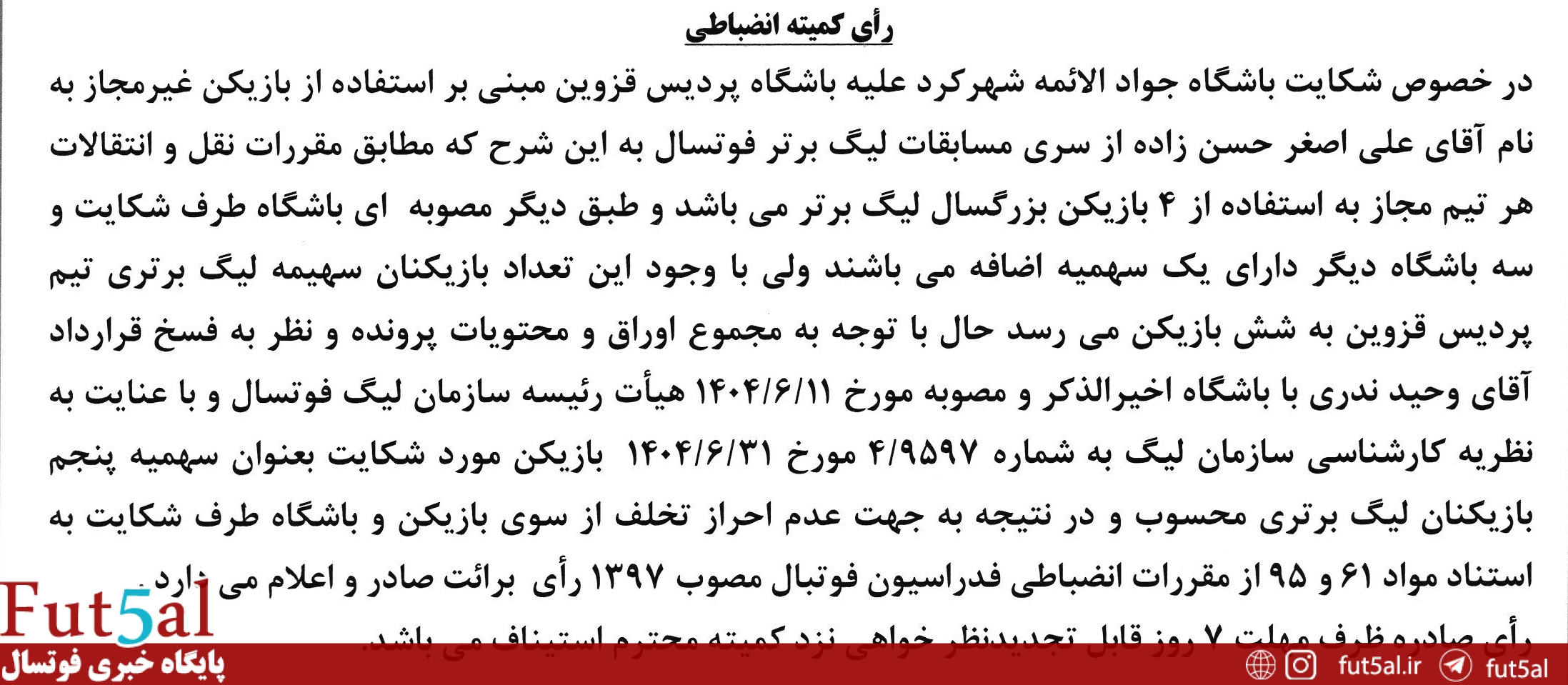 به گزارش پایگاه خبری فوتسال،رای دعوی باشگاه جواد الائمه شهر کرد به طرفیت پردیس قزوین به شرح زیر است: