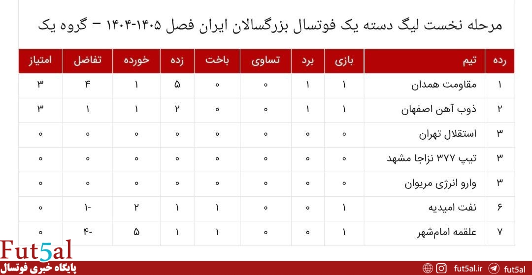 به گزارش پایگاه خبری فوتسال هفته اول لیگ دسته اول امروز ر گروه اول این رقابتها پیگیری شد و نتایج زیر در آن رقم خورد: