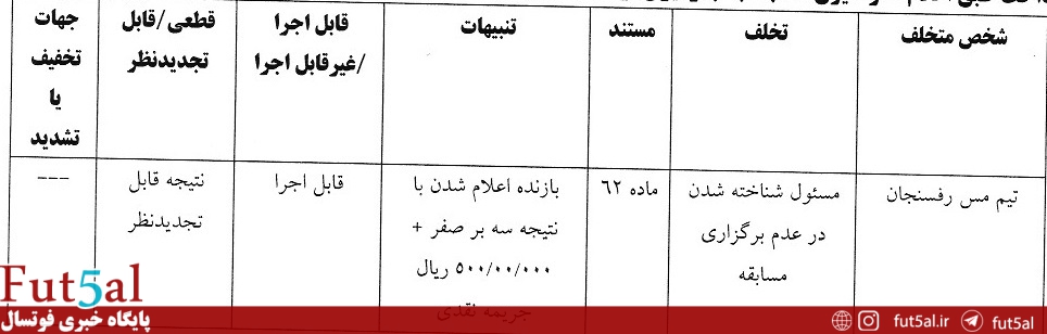 به گزارش پایگاه خبری فوتسال، تیم مس رفسنجان در هفته دوم لیگ برتر بانوان مقابل استقلال حاضر نشد. کمیته انضباطی رای این دیدار را به شرح زیر ضادر کرد: