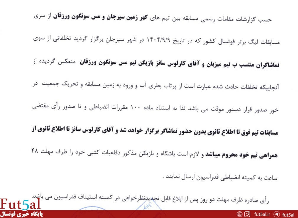 به گزارش پایگاه خبری فوتسال، رای دستور موقت تماشاگران تیم گهر زمین و کارلوس سانز بازیکن مس سونگون به شرح زیر است: