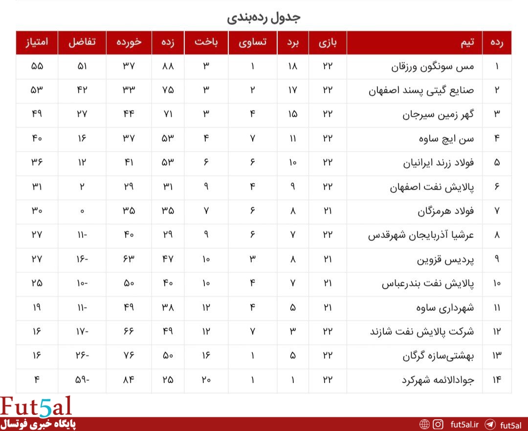 به گزارش پایگاه خبری فوتسال ، هفته بیست و دوم لیگ برتر فوتسال با شکست گیتی پسند در دربی اصفهان و صعود مس سونگون به صدر جدول همراه بود.