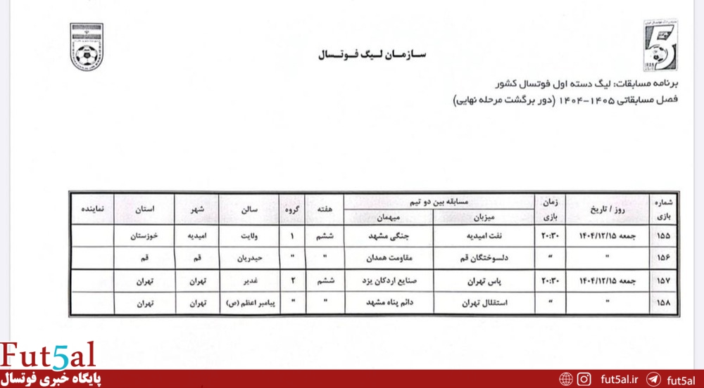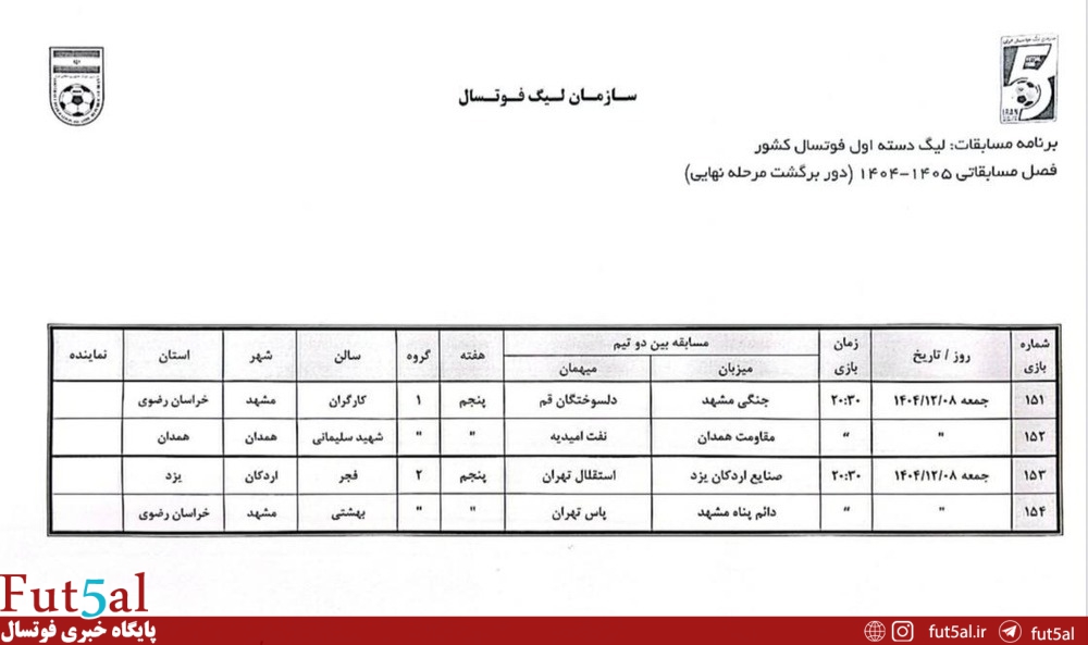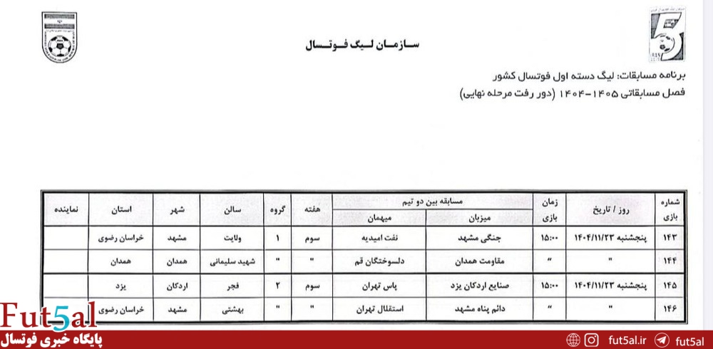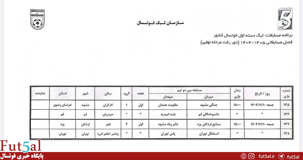 سازمان لیگ فوتسال برنامه کامل مرحله پلی آف لیگ دسته اول را اعلام کرد.