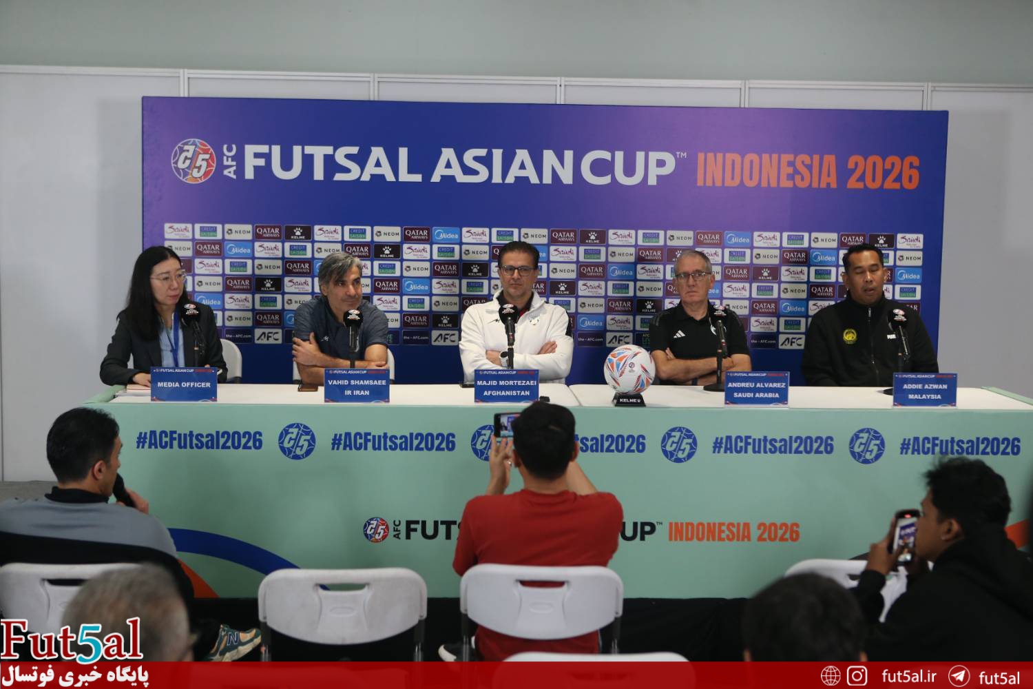 نشست خبری مربیان گروه D رقابتهای جام ملتهای فوتسال آسیا ۲۰۲۶ امروز با حضور سرمربیان تیمهای ایران، افغانستان، عربستان و مالزی برگزار شد.