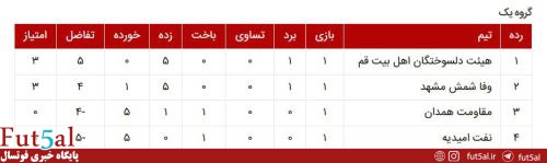 در رقابتهای هفته اول استقلال تهران و دائمپناه خراسان به پیروزی دست یافته و با کسب سه امتیاز در صدر گروه دوم قرار گرفتند ضمن اینکه در گروه یک نیز دلسوختگان قم و وفاشمش به برتری مقابل حریفان خود دست پیدا کرده و سه امتیاز را برای صدرنشینی تصاحب کردند.