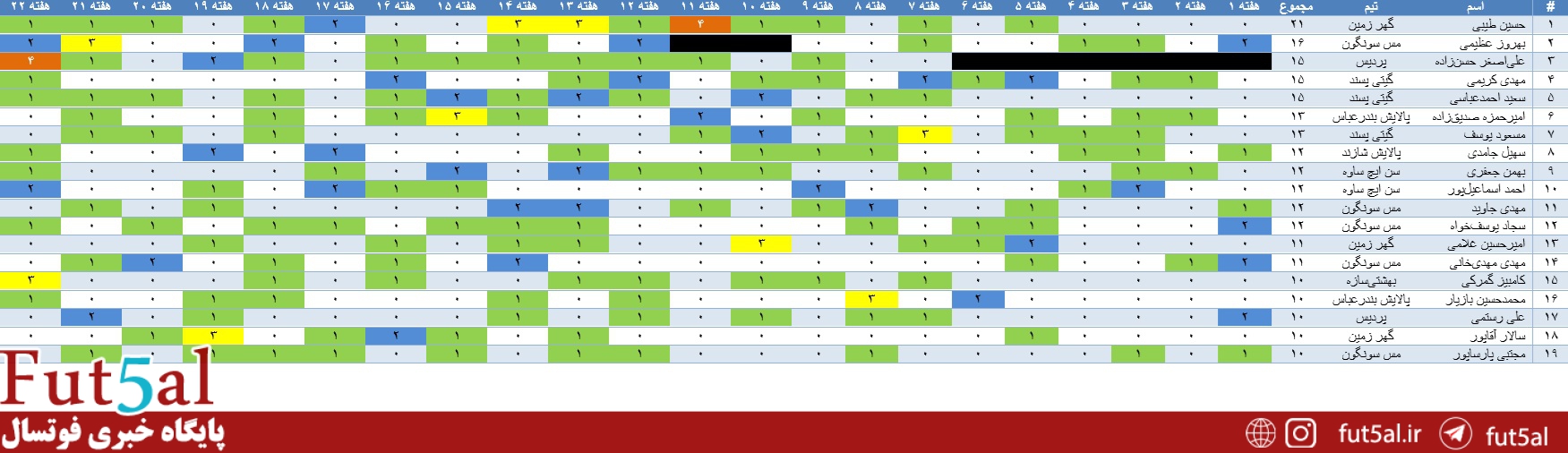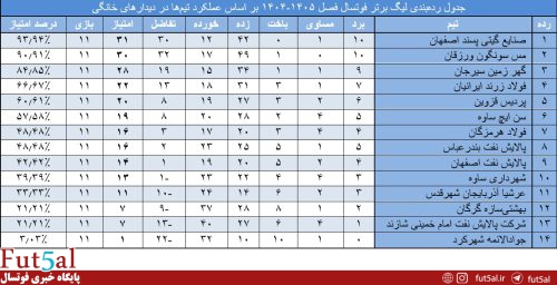 پایگاه خبری فوتسال/ سعید پروا، هر هفته به مرور آماری بازیهای لیگ برتر خواهیم پرداخت. بر این اساس آمار بازیهای لیگ پس از پایان هفته بیستودوم به شرح زیر است