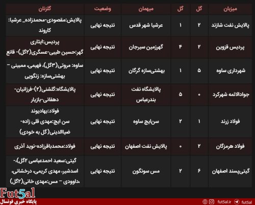 نتایج کامل دیدارهای امروز و جدول بازیها به شرح زیر است: