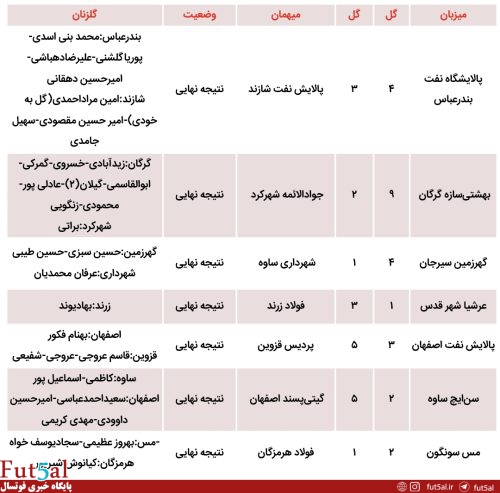 نتایج کامل دیدارهای امروز و جدول بازیها به شرح زیر است: