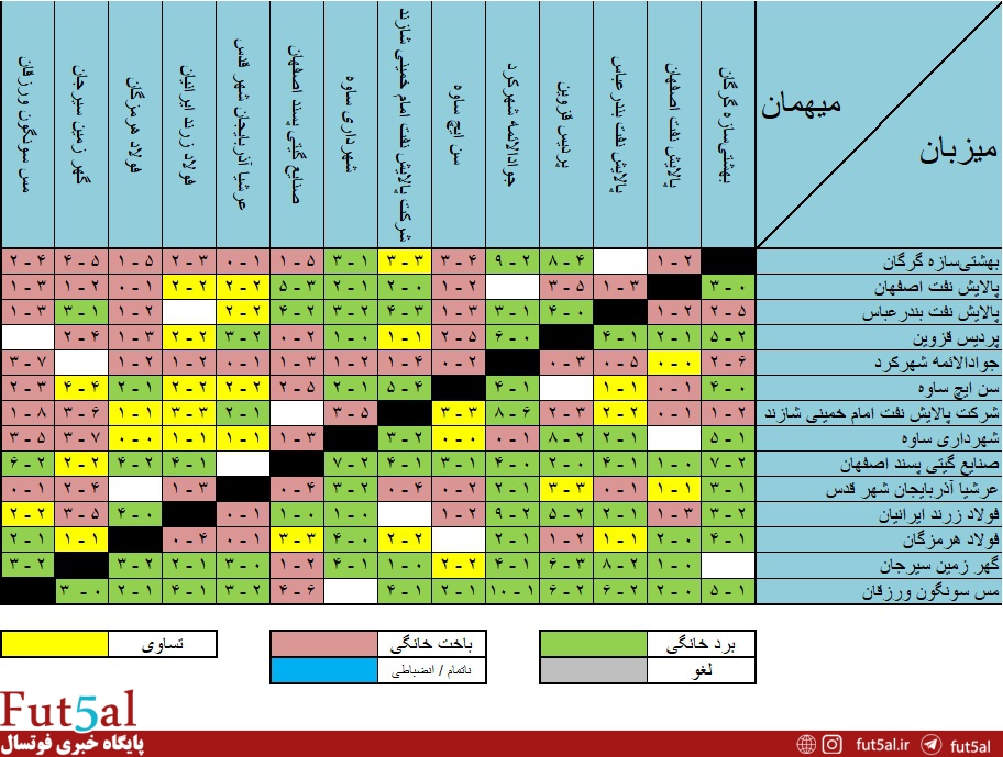 بیشترین برد: صنایع گیتی پسند اصفهان و مس سونگون ورزقان (۱۹ برد)