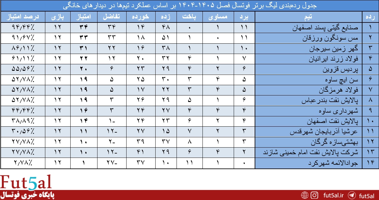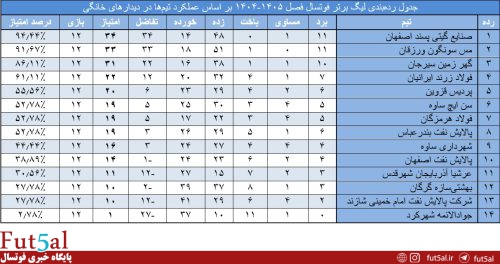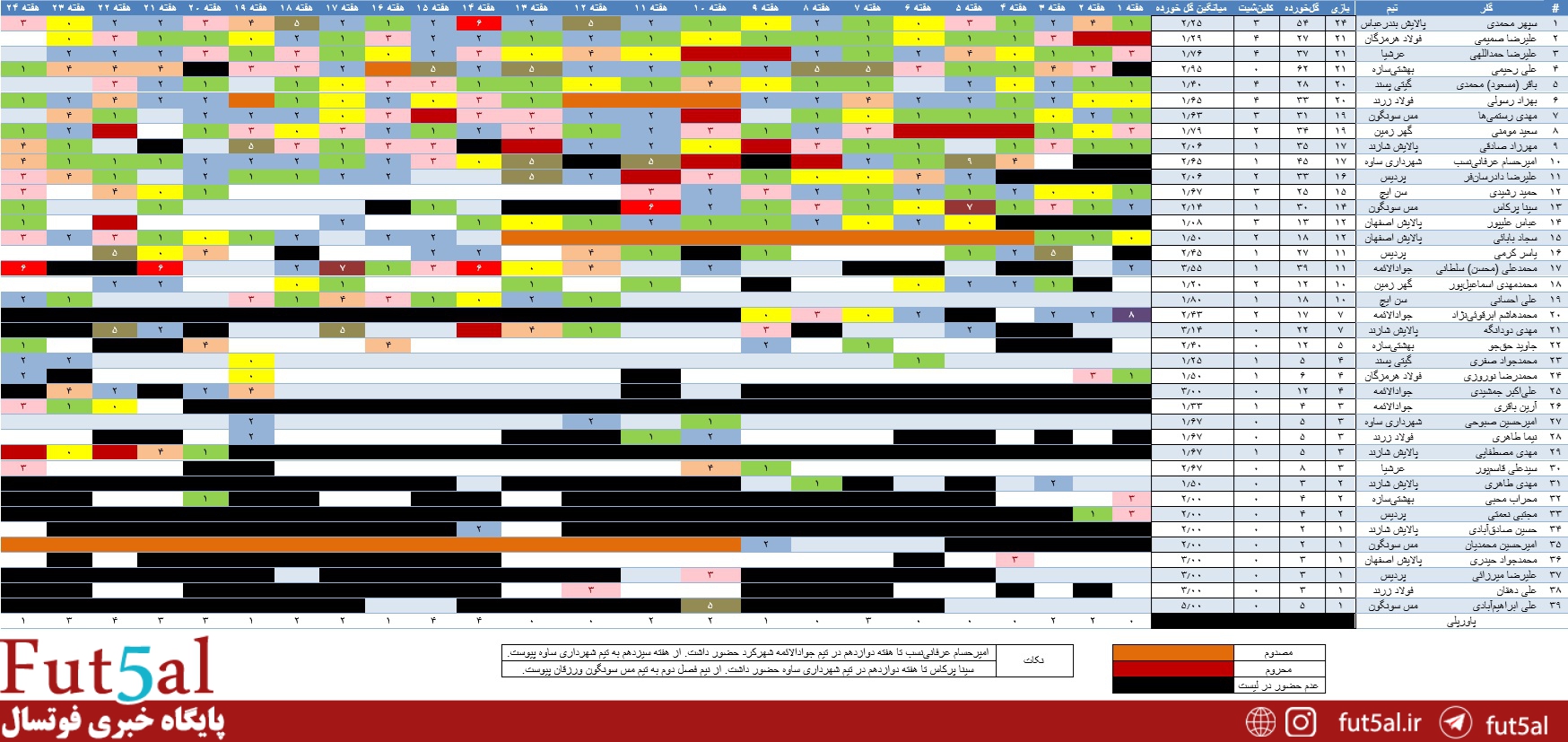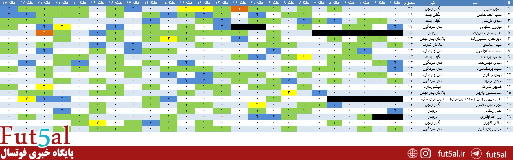 پایگاه خبری فوتسال/ سعید پروا، هر هفته به مرور آماری بازیهای لیگ برتر خواهیم پرداخت. بر این اساس آمار بازیهای لیگ پس از پایان هفته بیستوچهارم به شرح زیر است